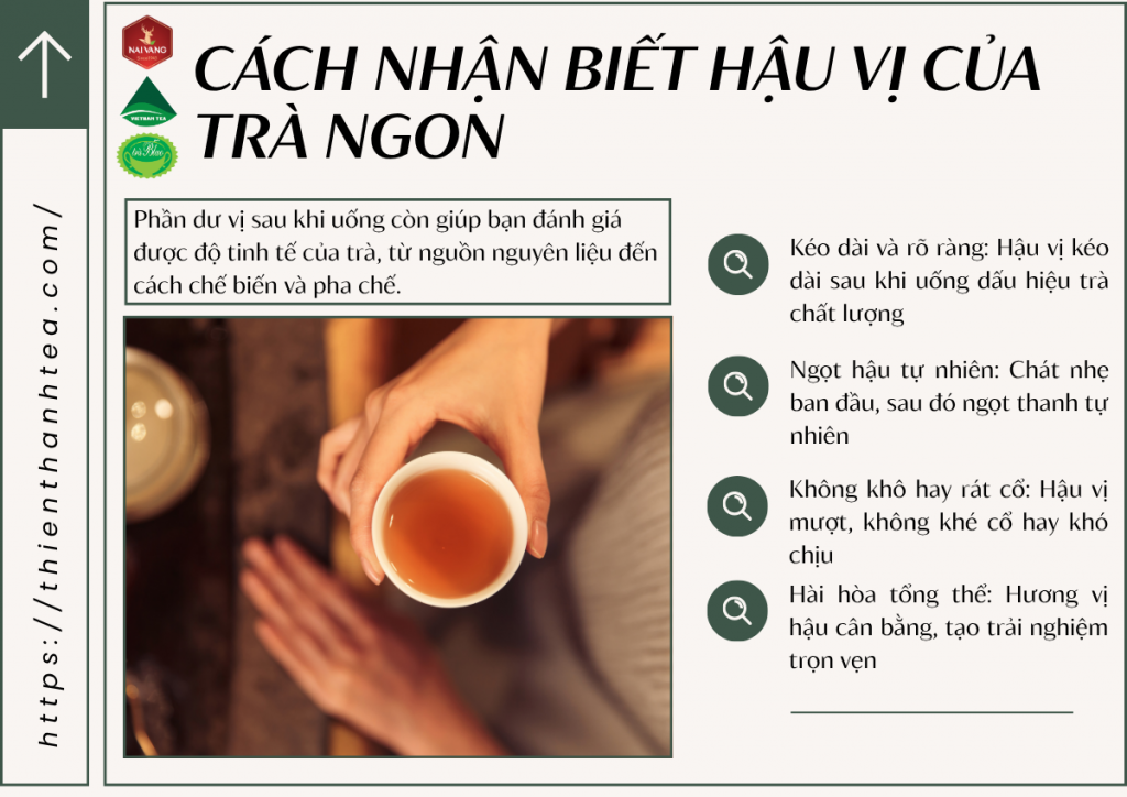 Sau khi đã hiểu khái niệm, việc nhận biết một loại trà có hậu vị tốt hay không sẽ giúp bạn phân biệt chính xác chất lượng thực sự của sản phẩm. Không chỉ dừng lại ở cảm nhận ban đầu, việc chú ý đến phần dư vị sau khi uống còn giúp bạn đánh giá được độ tinh tế của trà, từ nguồn nguyên liệu đến cách chế biến và pha chế.