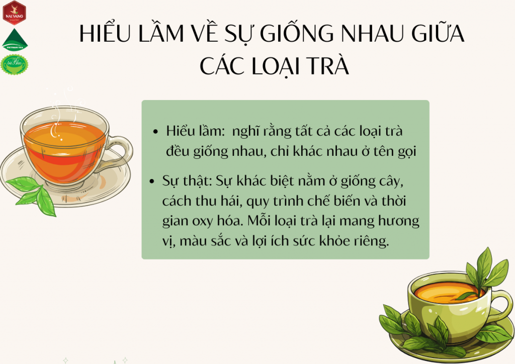 Nhiều người có hiểu lầm về trà khi nghĩ rằng tất cả các loại trà đều giống nhau, chỉ khác nhau ở tên gọi. Thực tế, sự khác biệt nằm ở giống cây, cách thu hái, quy trình chế biến và thời gian oxy hóa. Mỗi loại trà lại mang hương vị, màu sắc và lợi ích sức khỏe riêng.