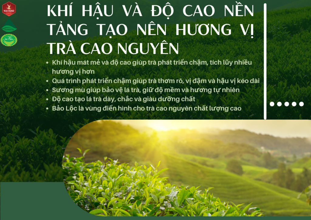 Những khu vực như Bảo Lộc (Lâm Đồng) là ví dụ điển hình cho điều kiện lý tưởng này. Nhờ khí hậu và độ cao phù hợp, trà cao nguyên tại đây luôn được đánh giá cao về chất lượng và hương vị.